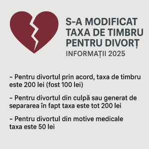 Începând cu 2025, conform Legii nr. 268/2024, taxa de timbru pentru divorț prin acord sau din culpă este de 200 lei (dublu față de vechea taxă de 100 lei).